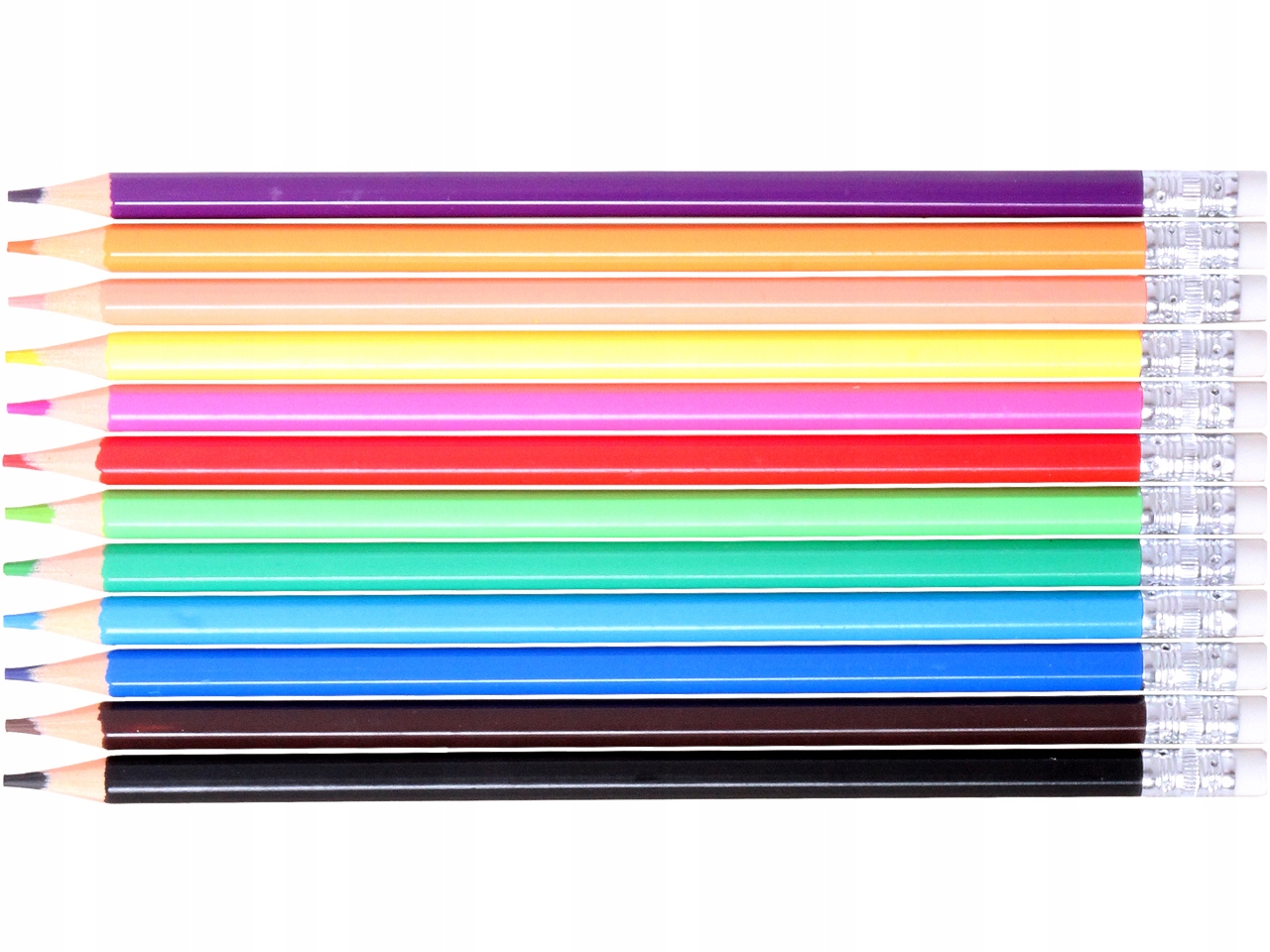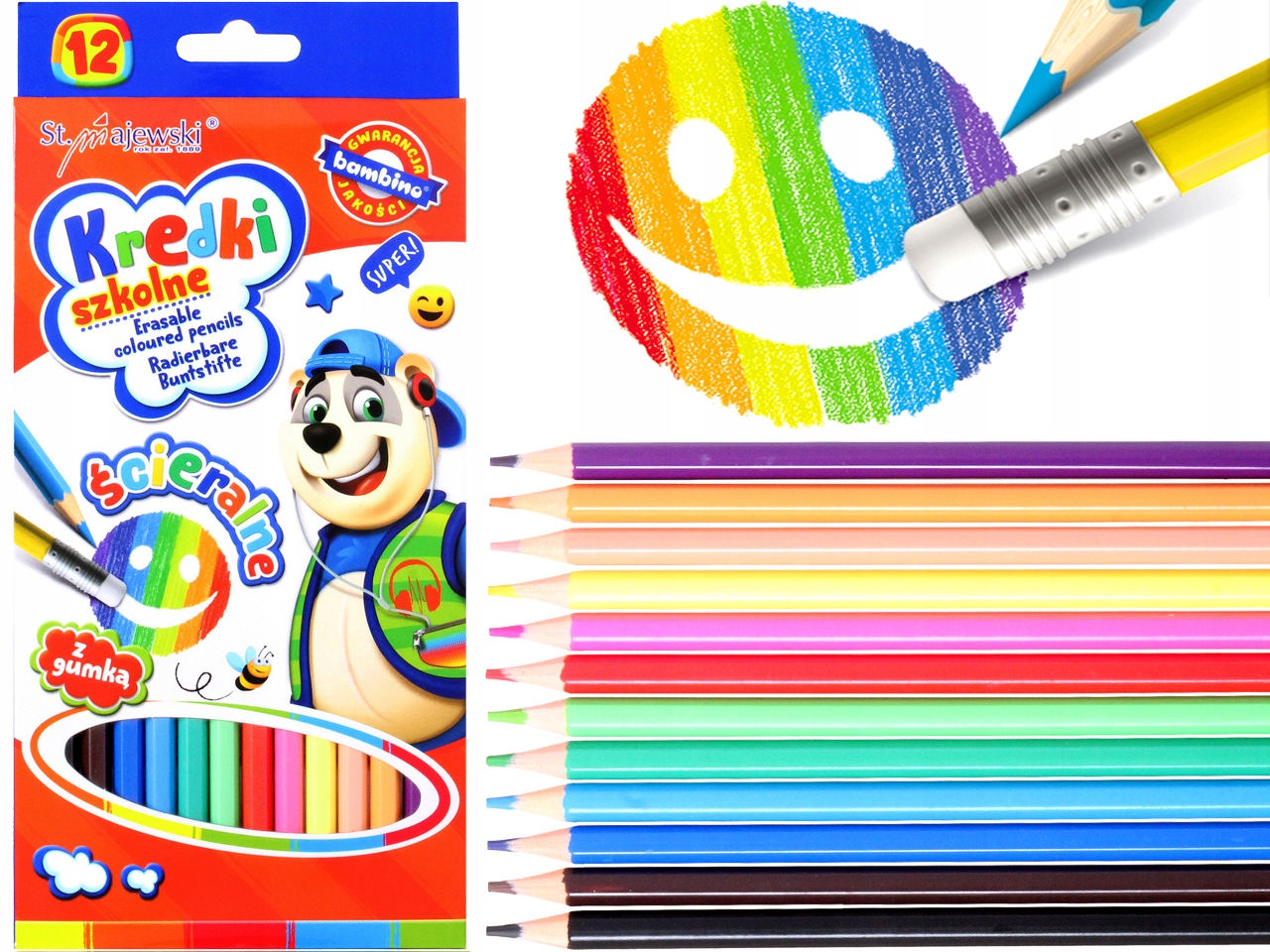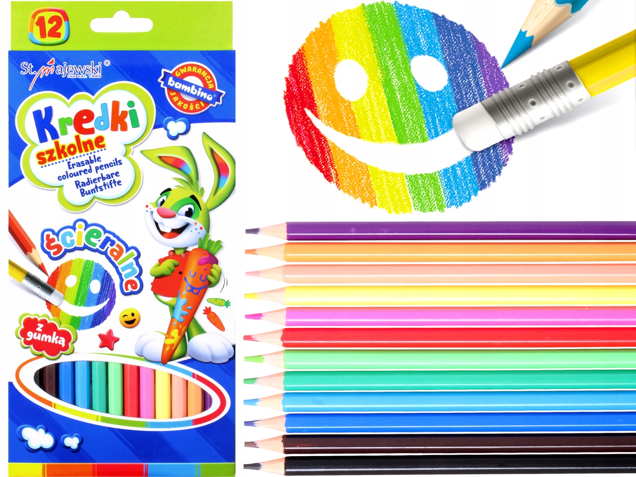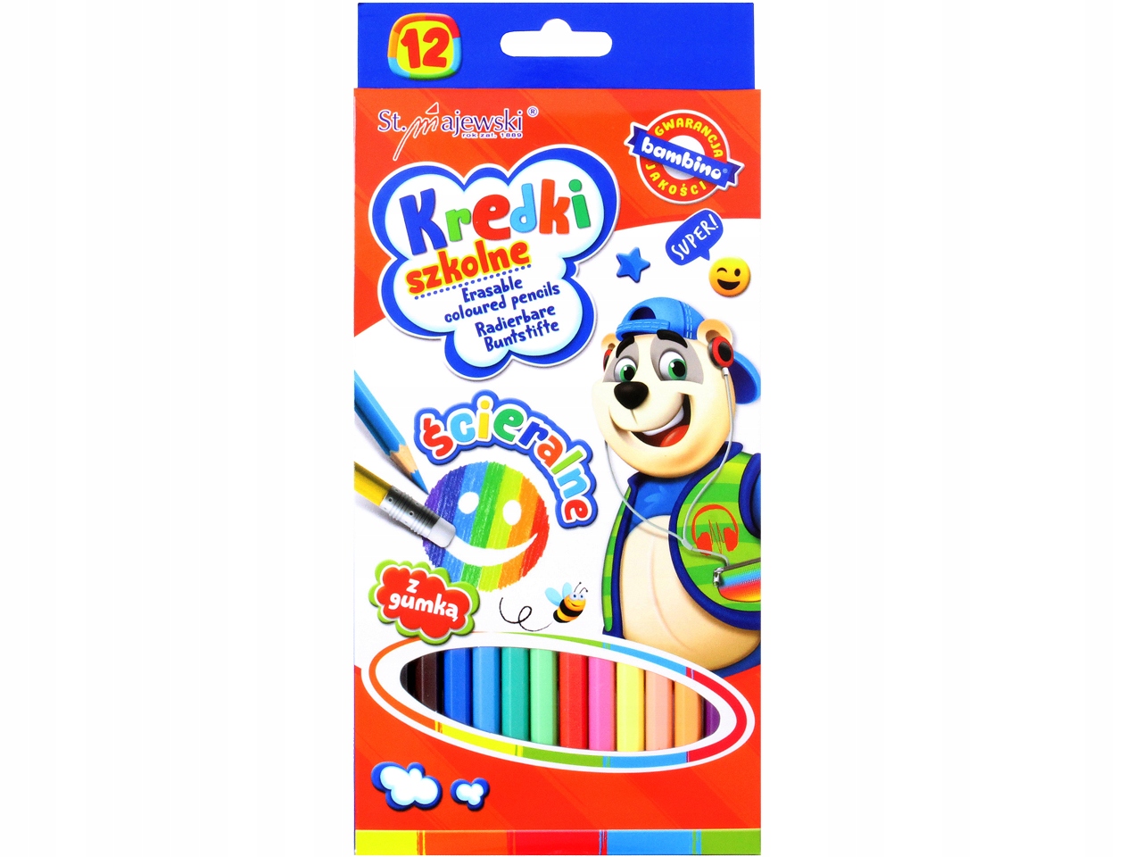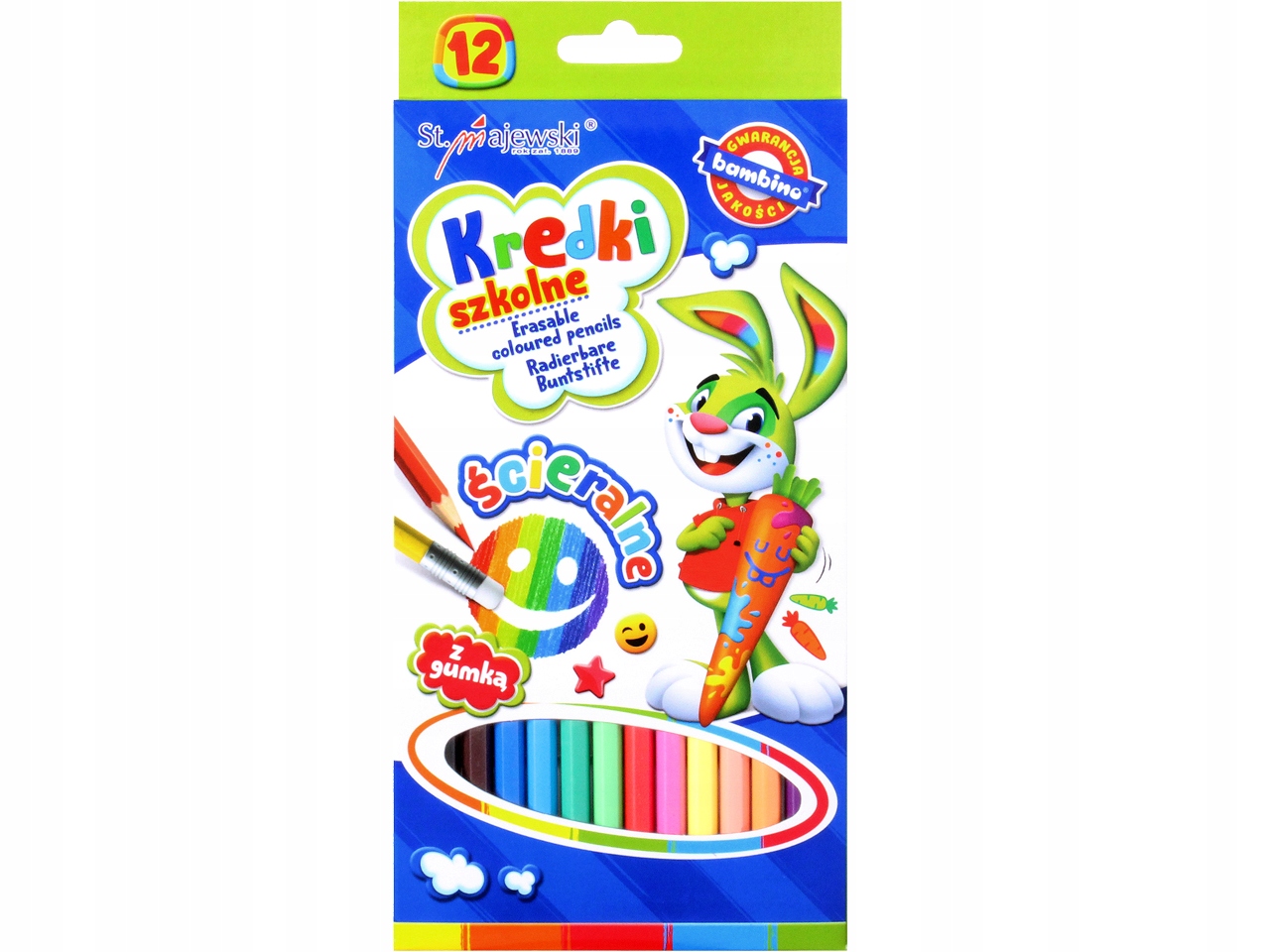 Ścieralne Kredki szkolne Bambino w 12 ciekawych kolorach.