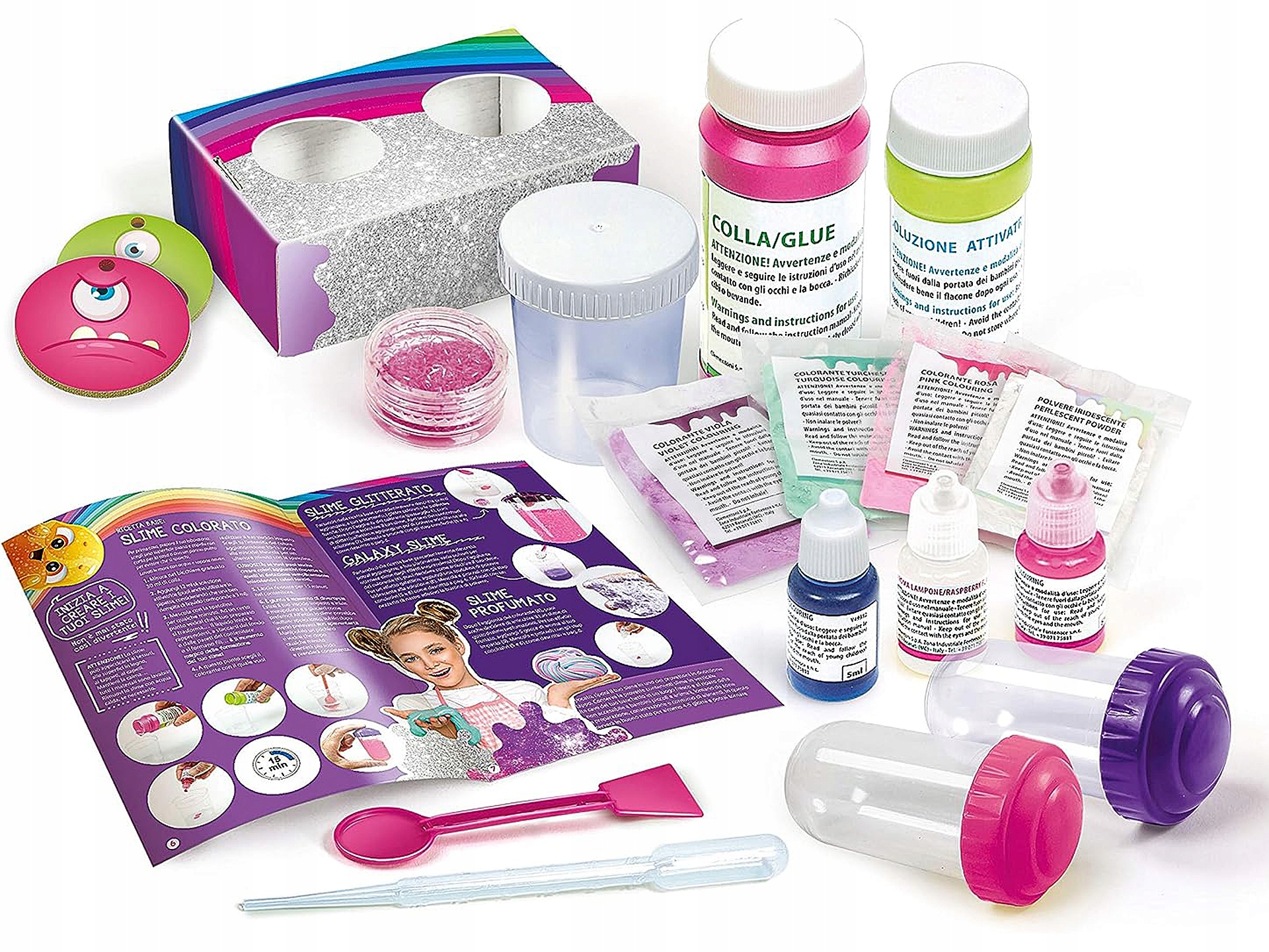 Zestaw zawiera brokat, barwniki, aromaty i bogatą gamę narzędzi laboratoryjnych, gwarantujących świetną zabawę.