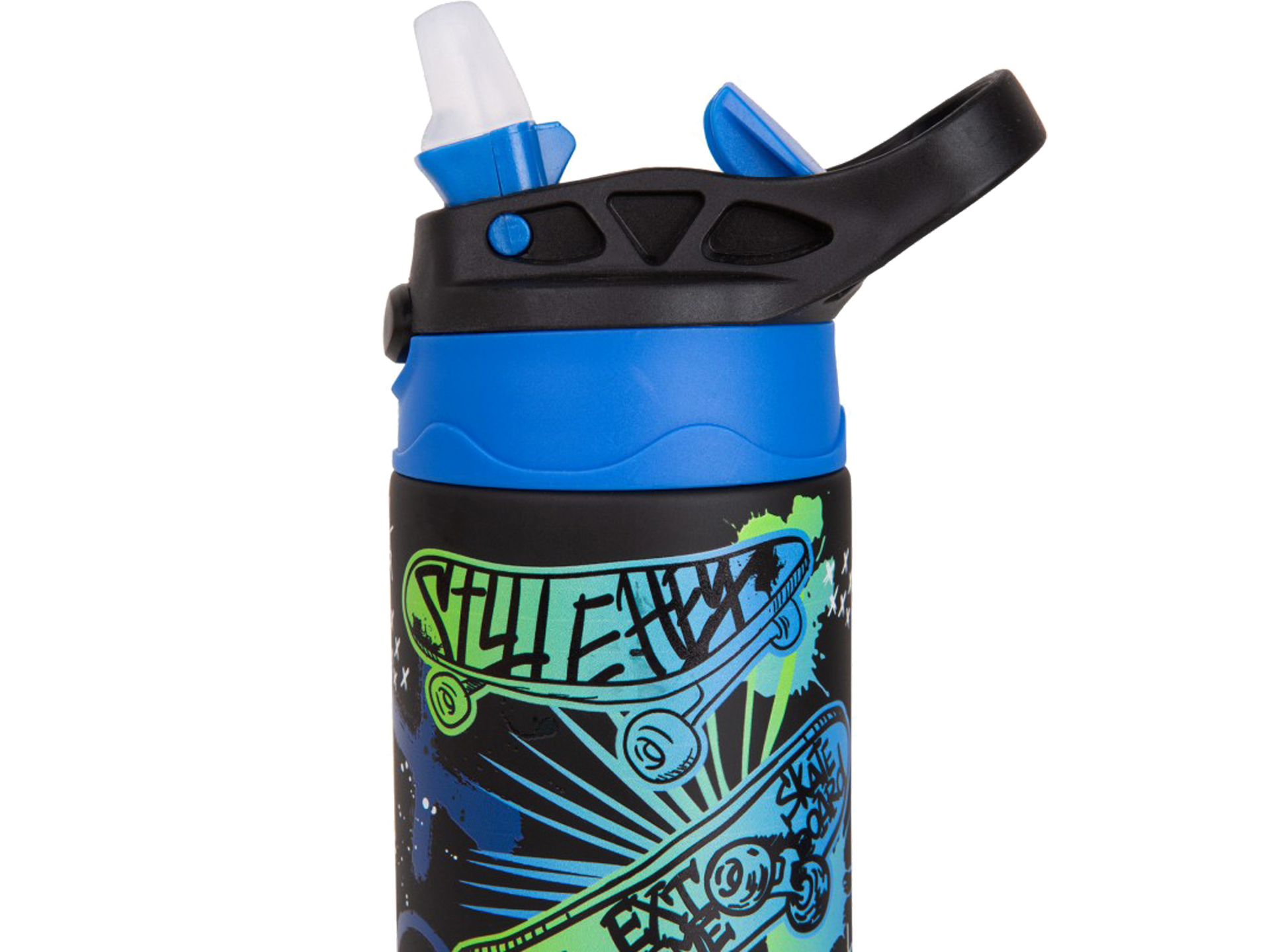 Butelka posiada wygodny system otwierania oraz rurkę ułatwiająca picie nawet najmłodszym użytkownikom.