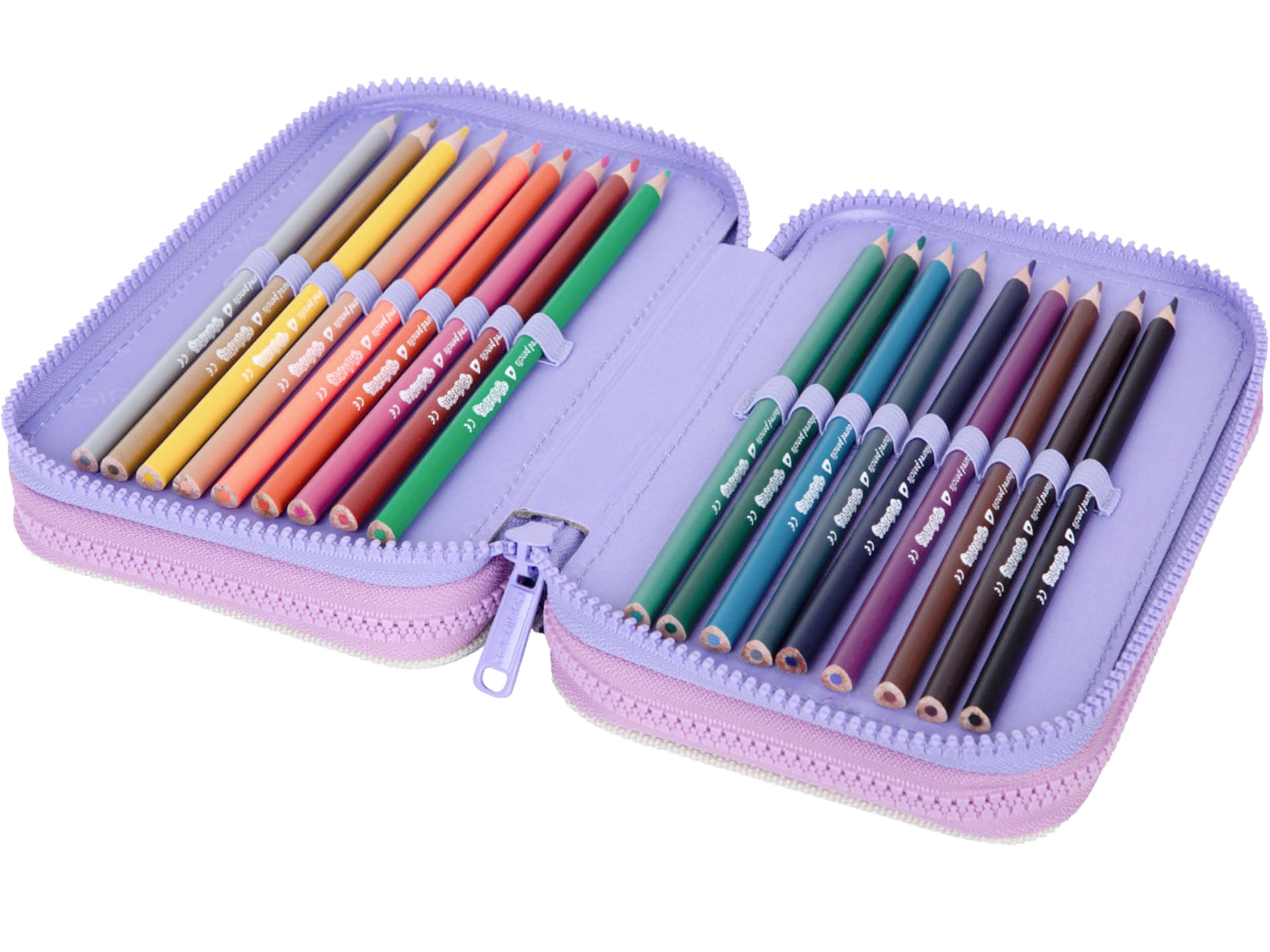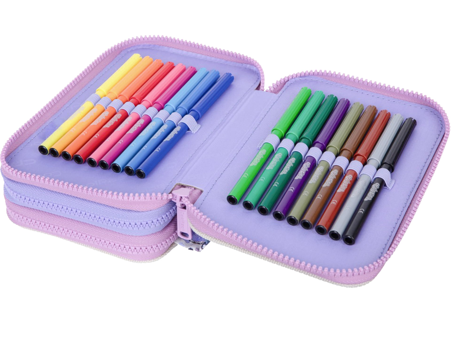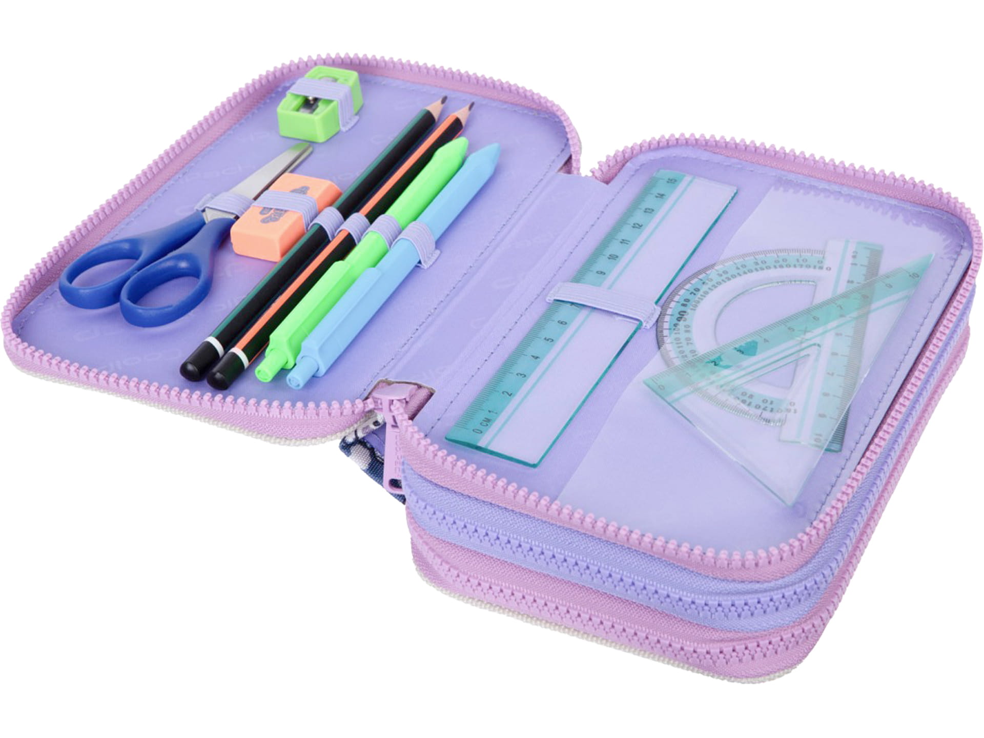 Potrójny piórnik z wyposażeniem wykonany jest
