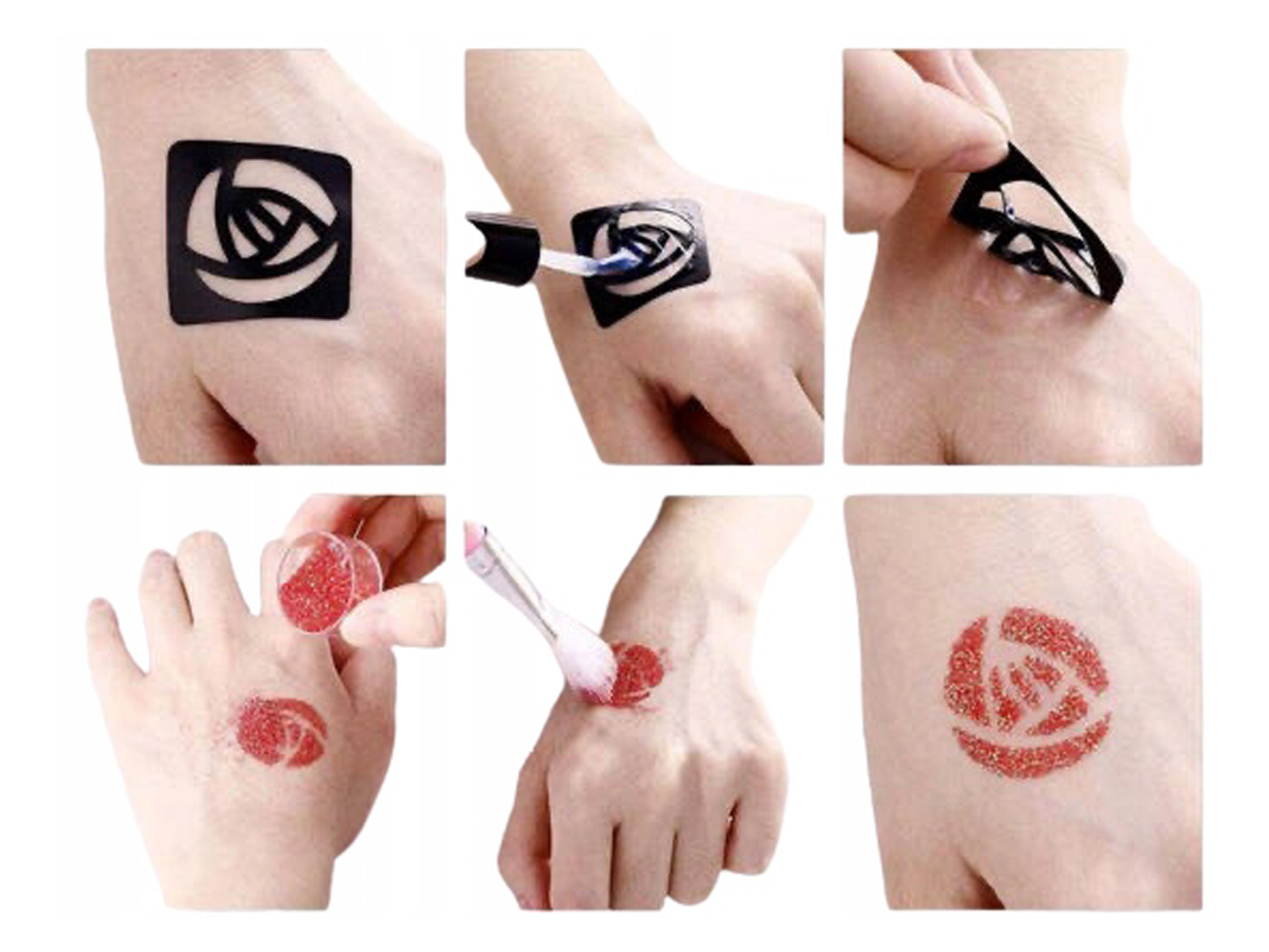 nałóż brokat, poczekaj aż wyschnie i usuń nadmiar brokatu. Tatuaże to