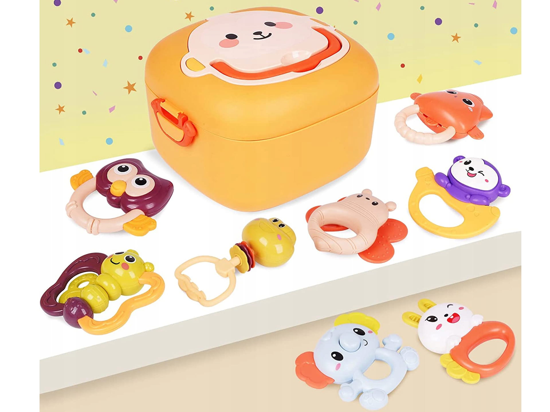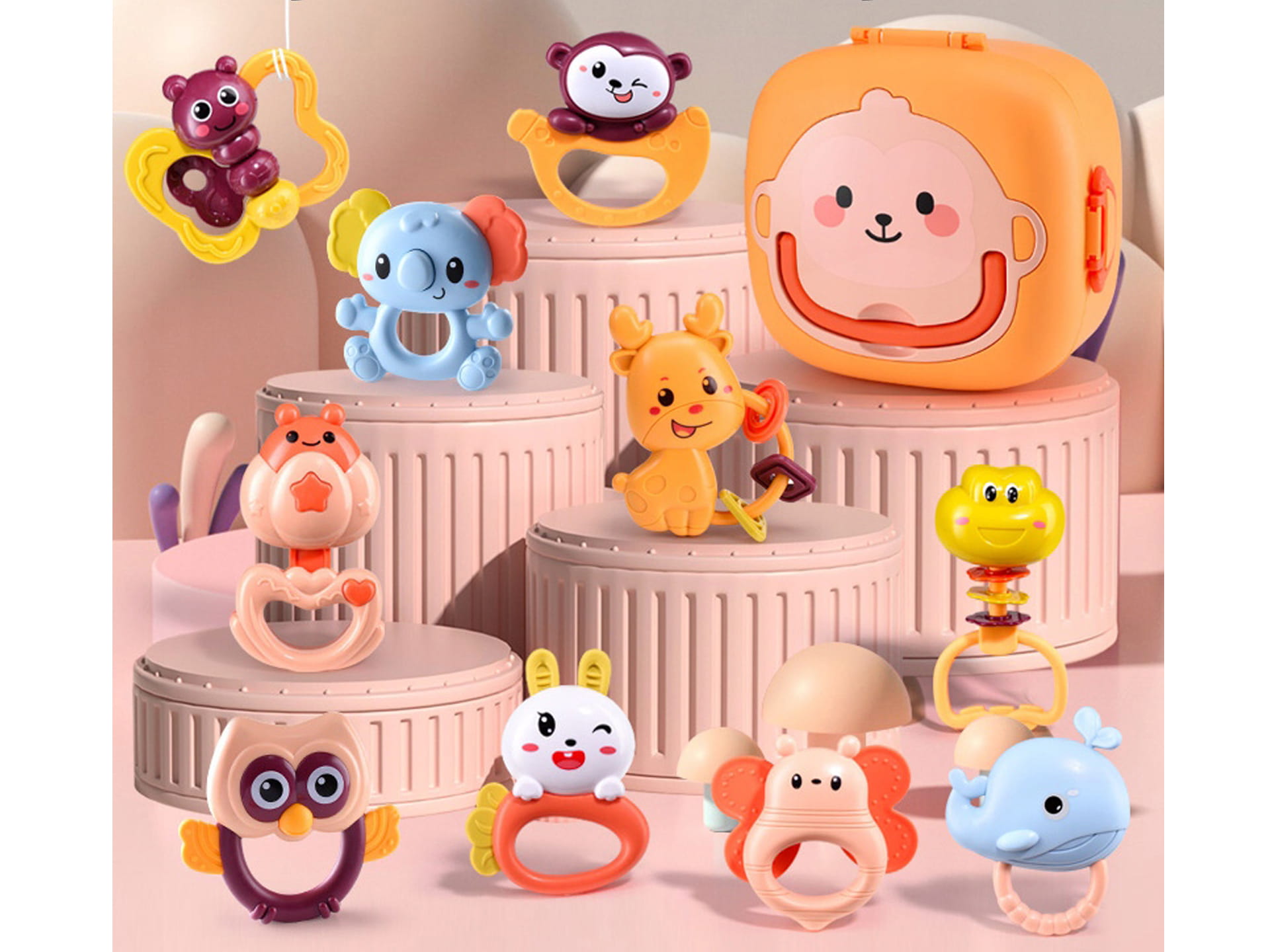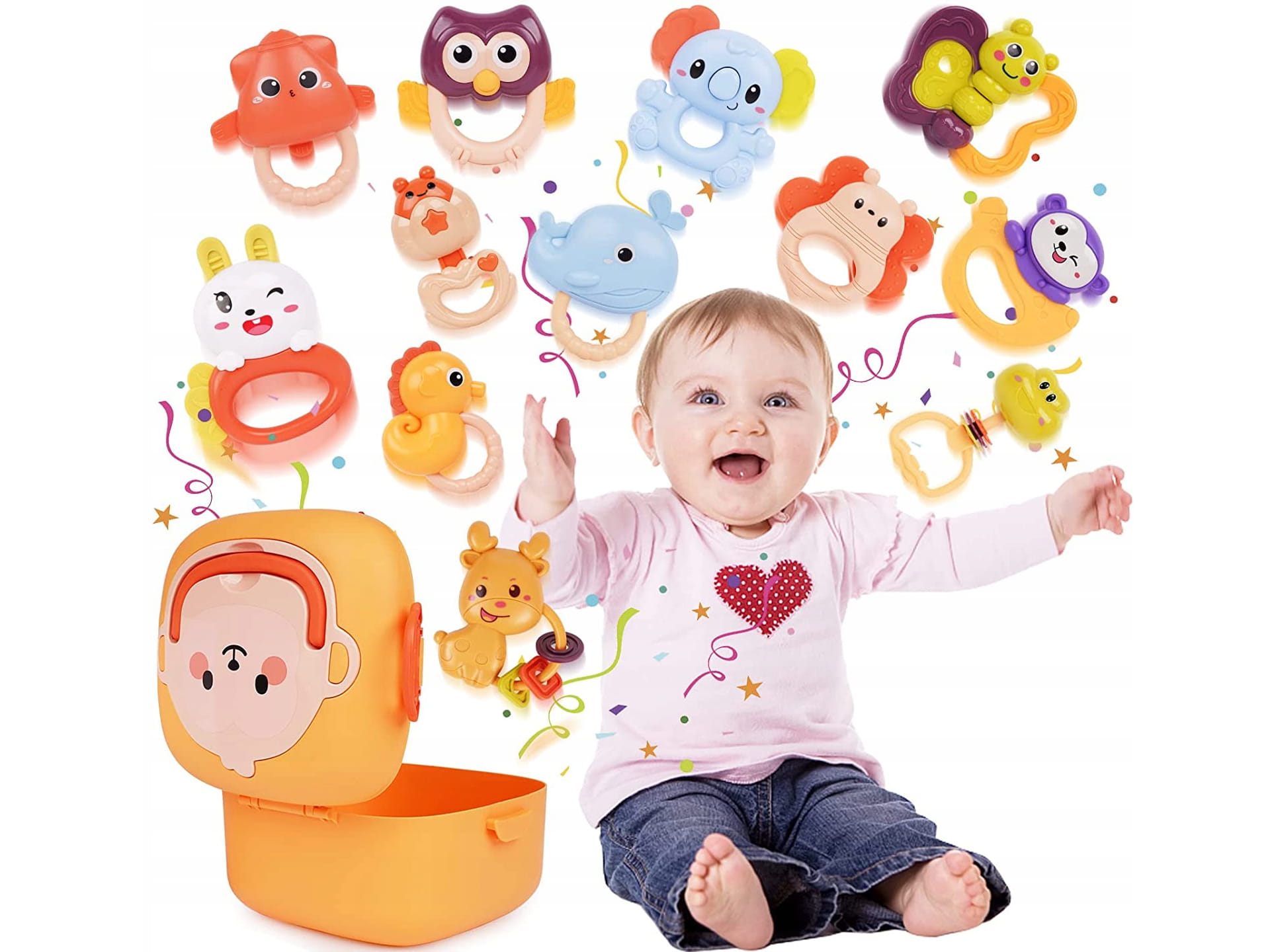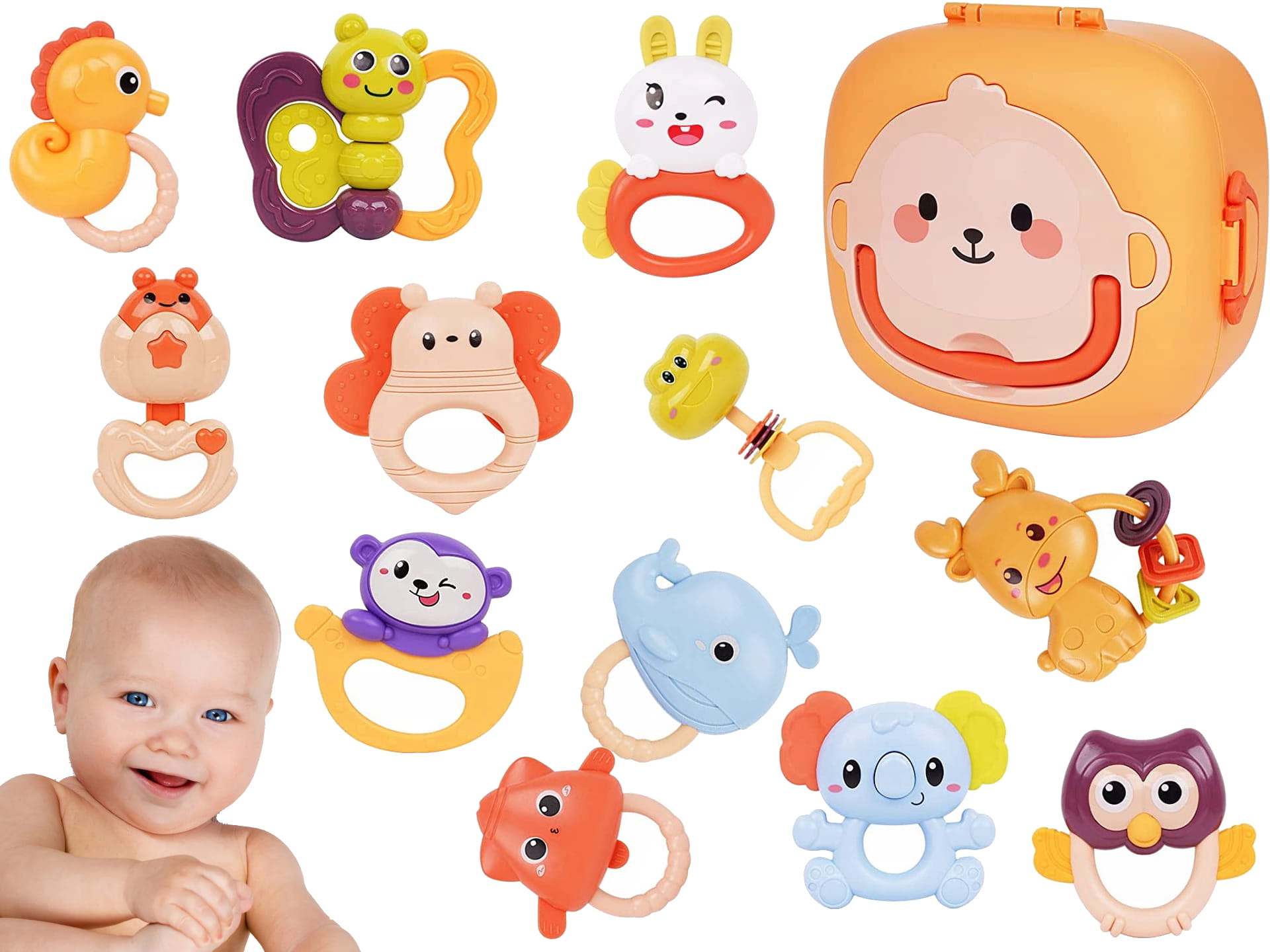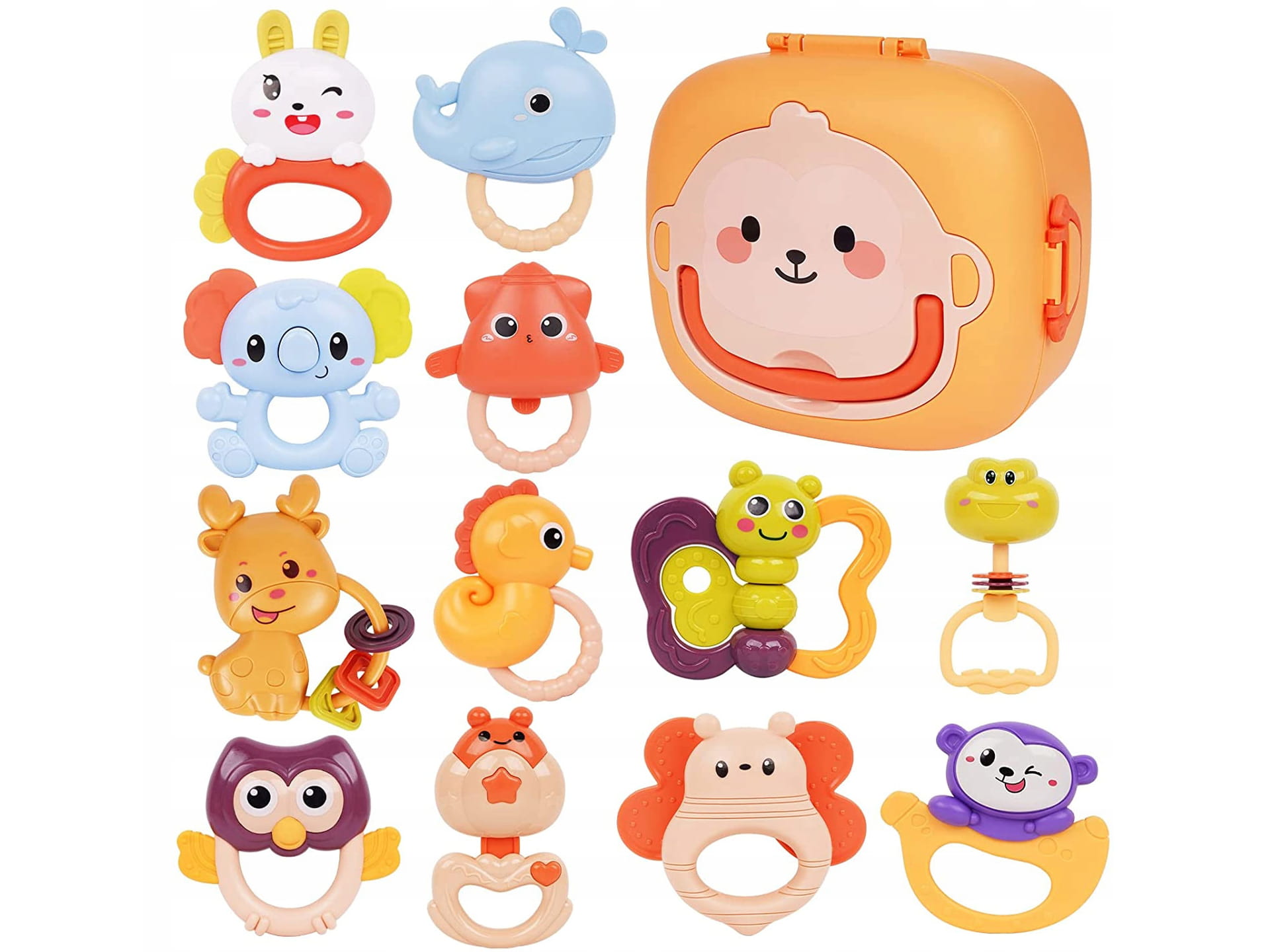 GRZECHOTKI Gryzaki ZWIERZĄTKA w Walizce 12el ZESTAW GRZECHOTEK Sensoryczne