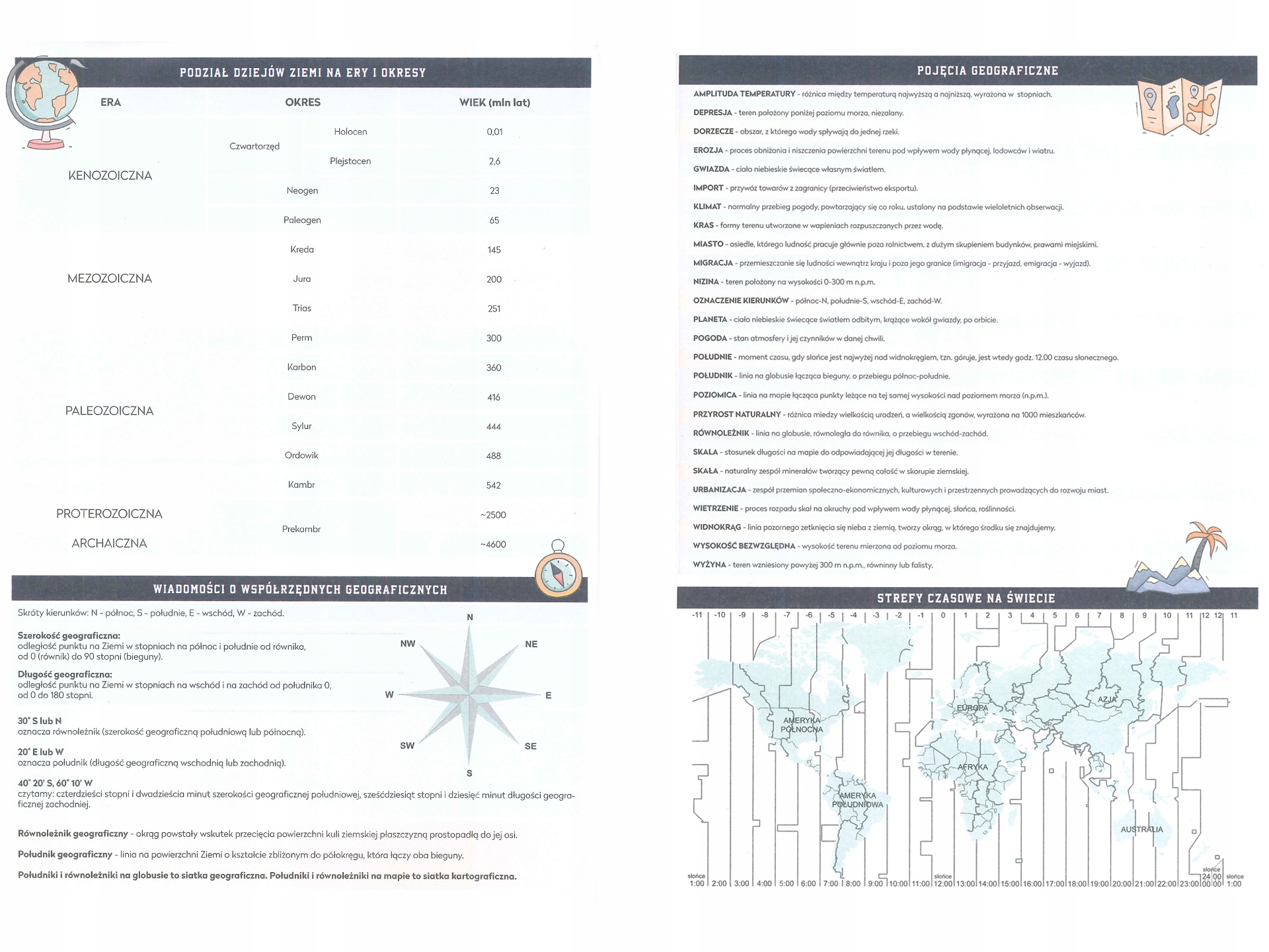 Na wewnętrznych okładkach zeszytu znajduje się ściąga z geografii (np. strefy czasowe na świecie).