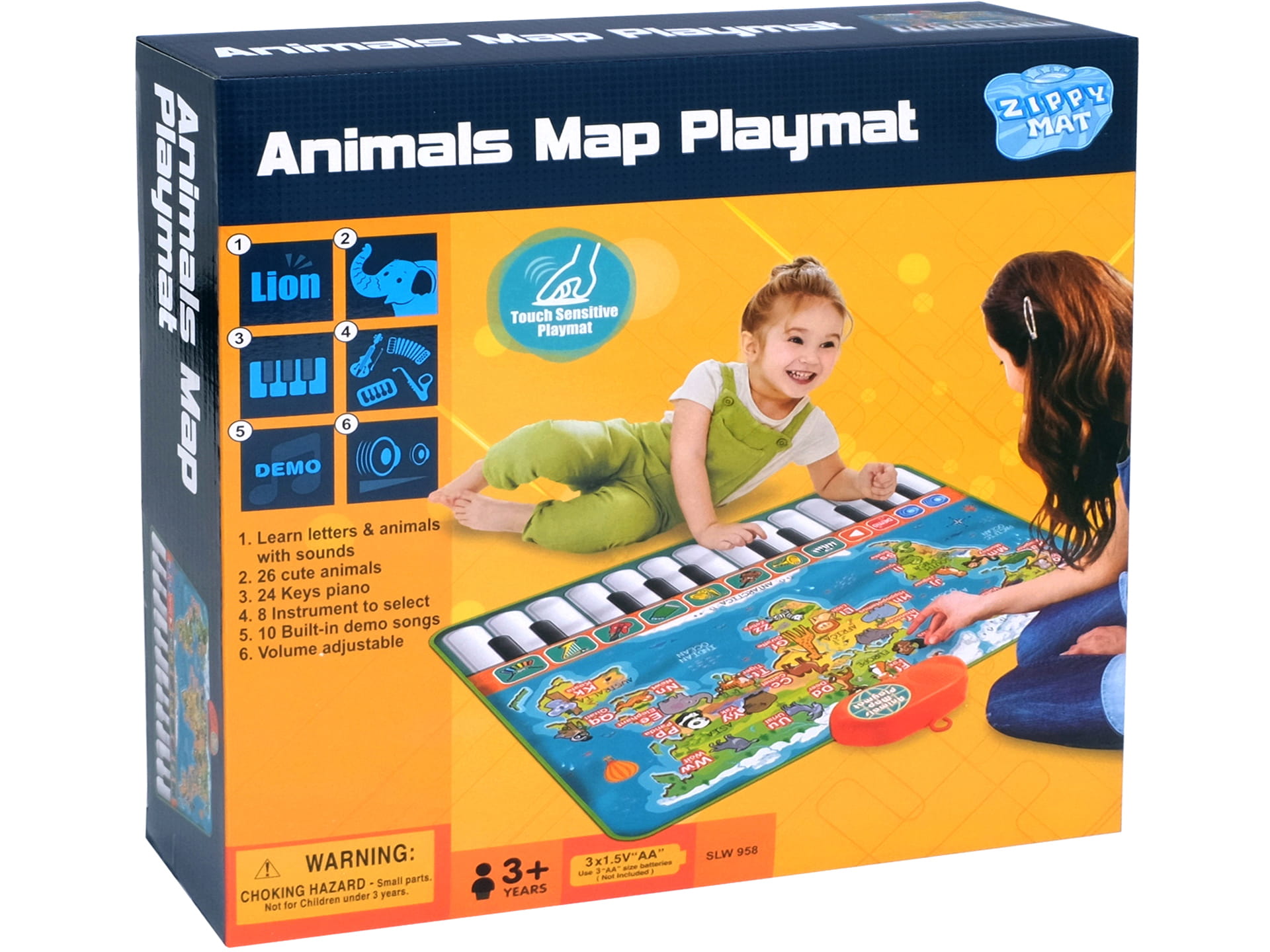 Na macie znajdują się kolorowe zwierzątka z dźwiękami w języku angielskim,
