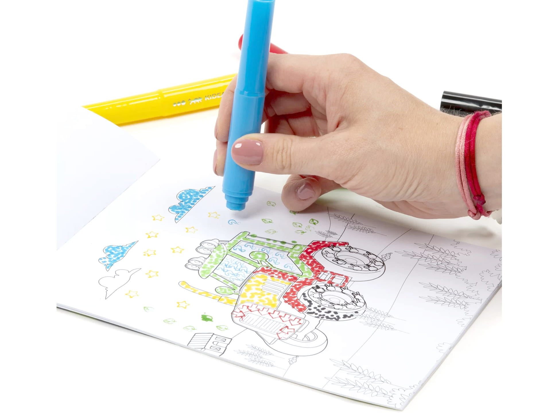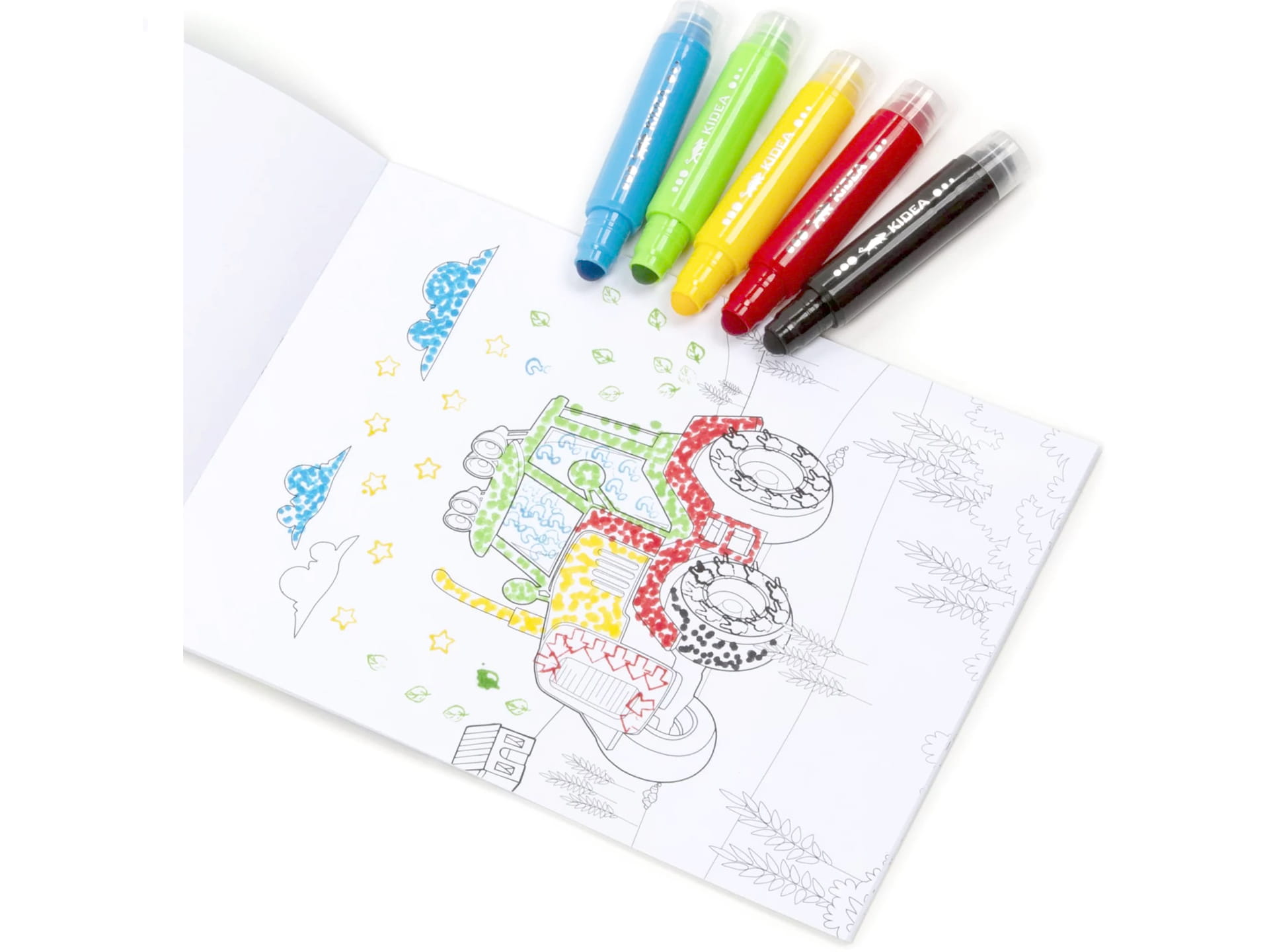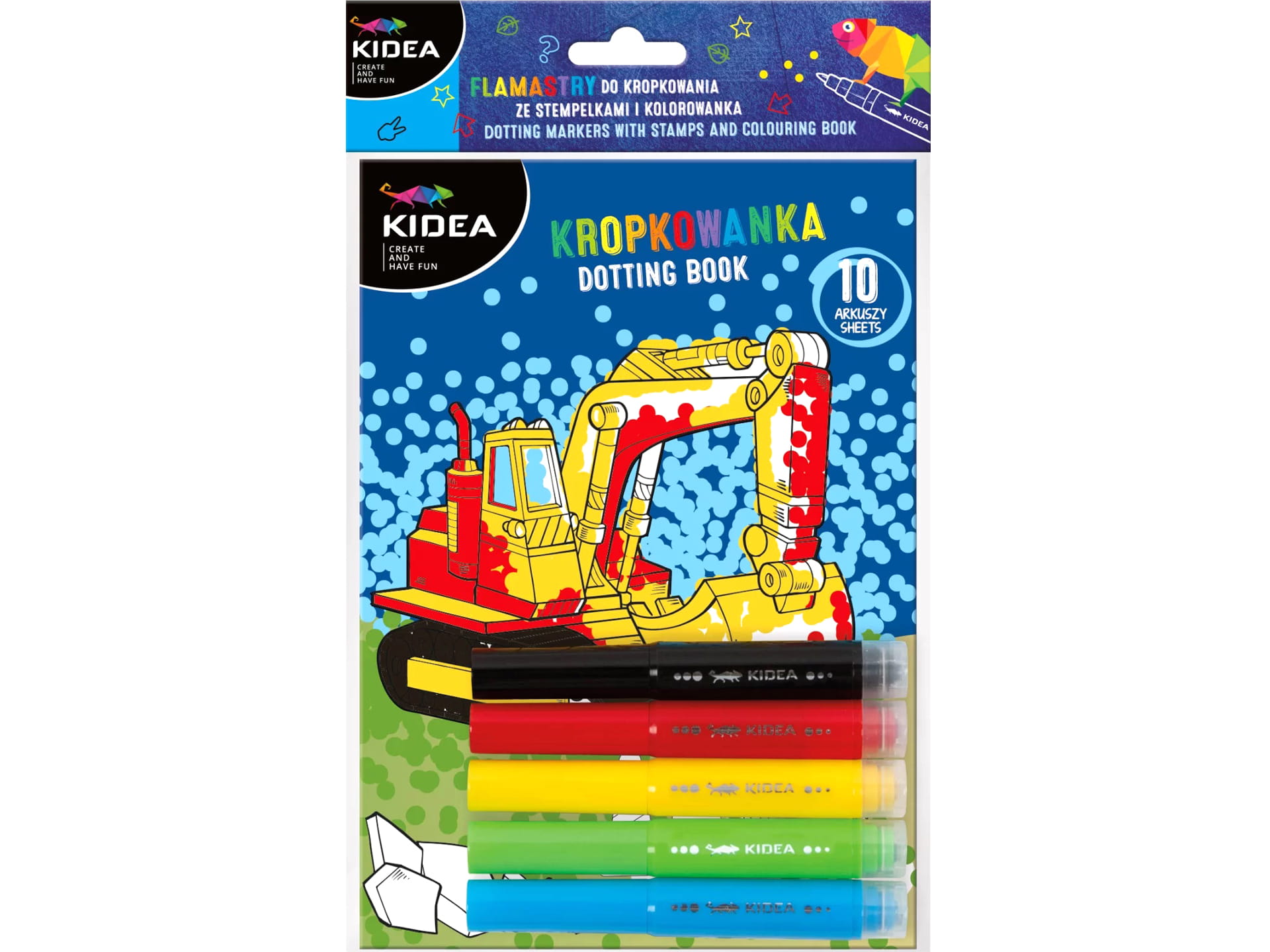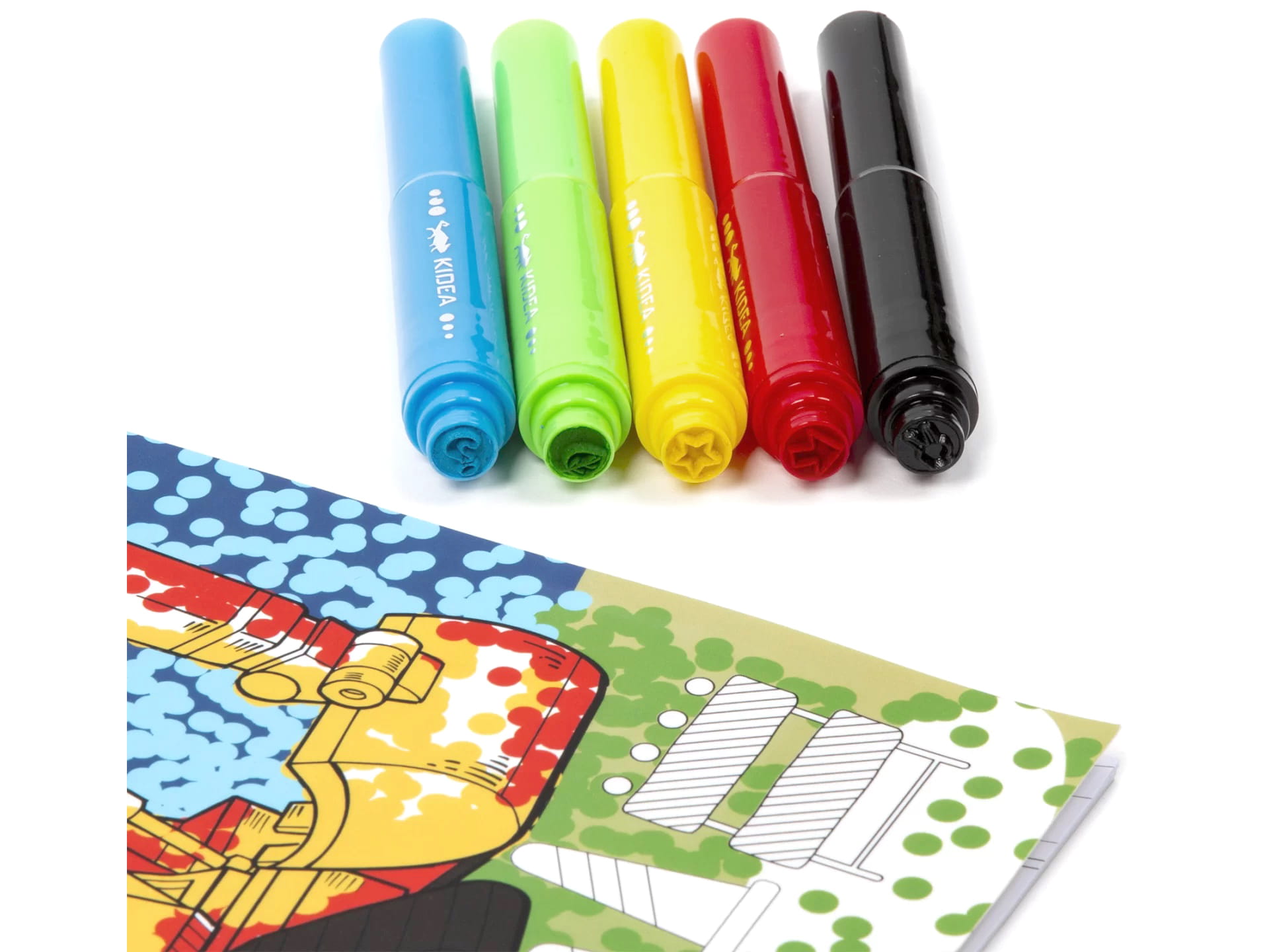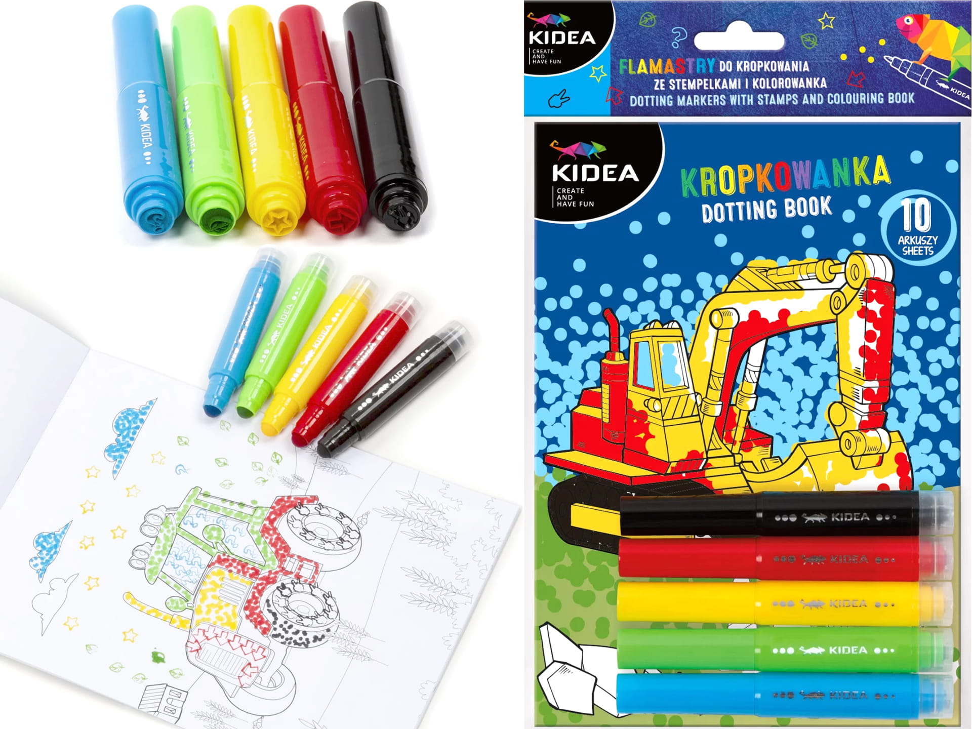 KIDEA Kolorowanka + FLAMASTRY DO MALOWANIA KROPKAMI POJAZDY Stempelki