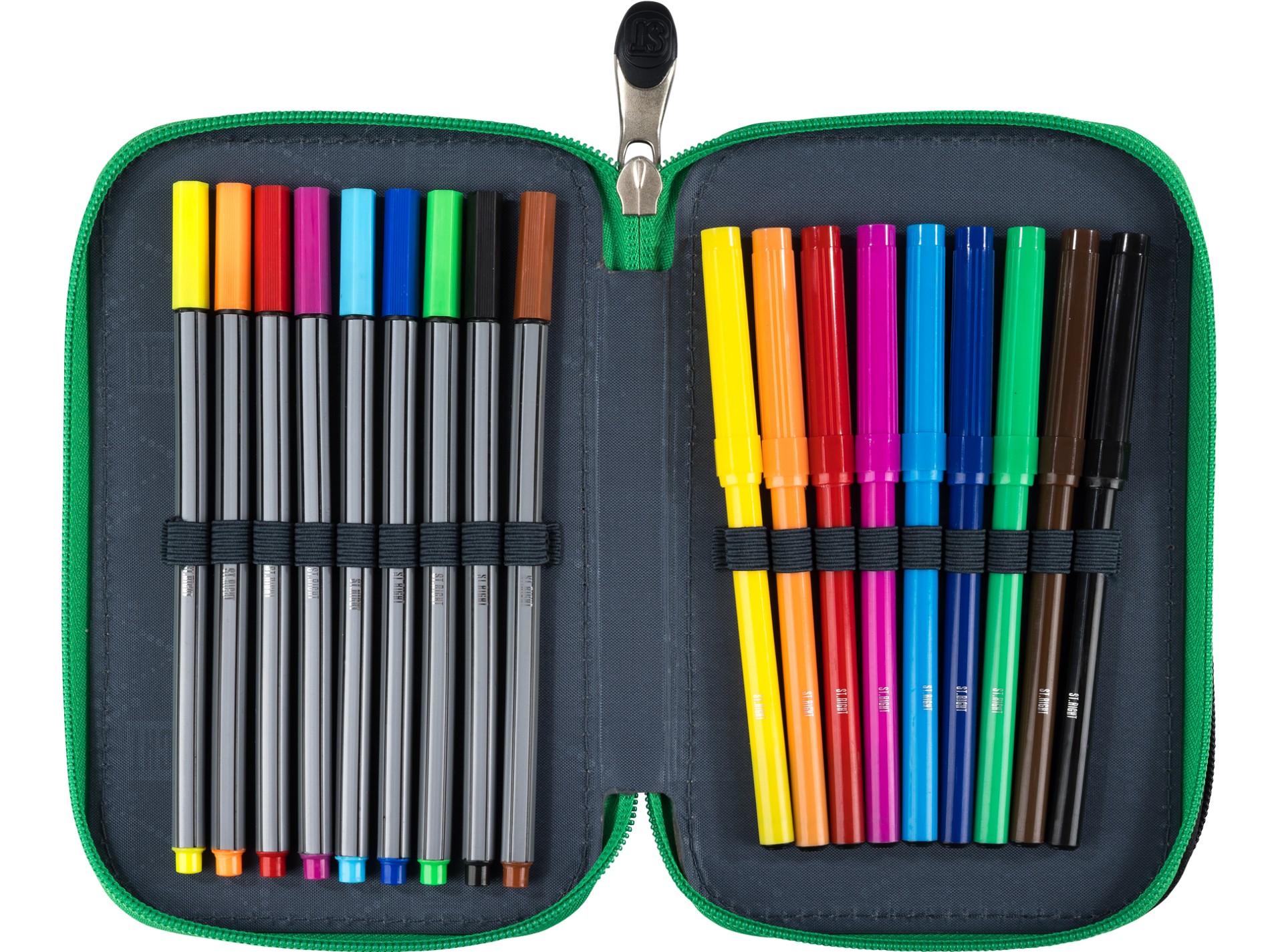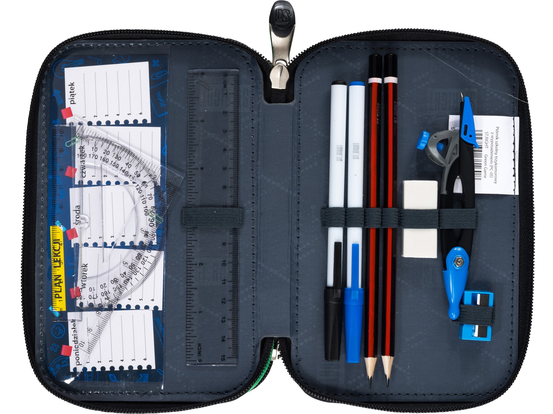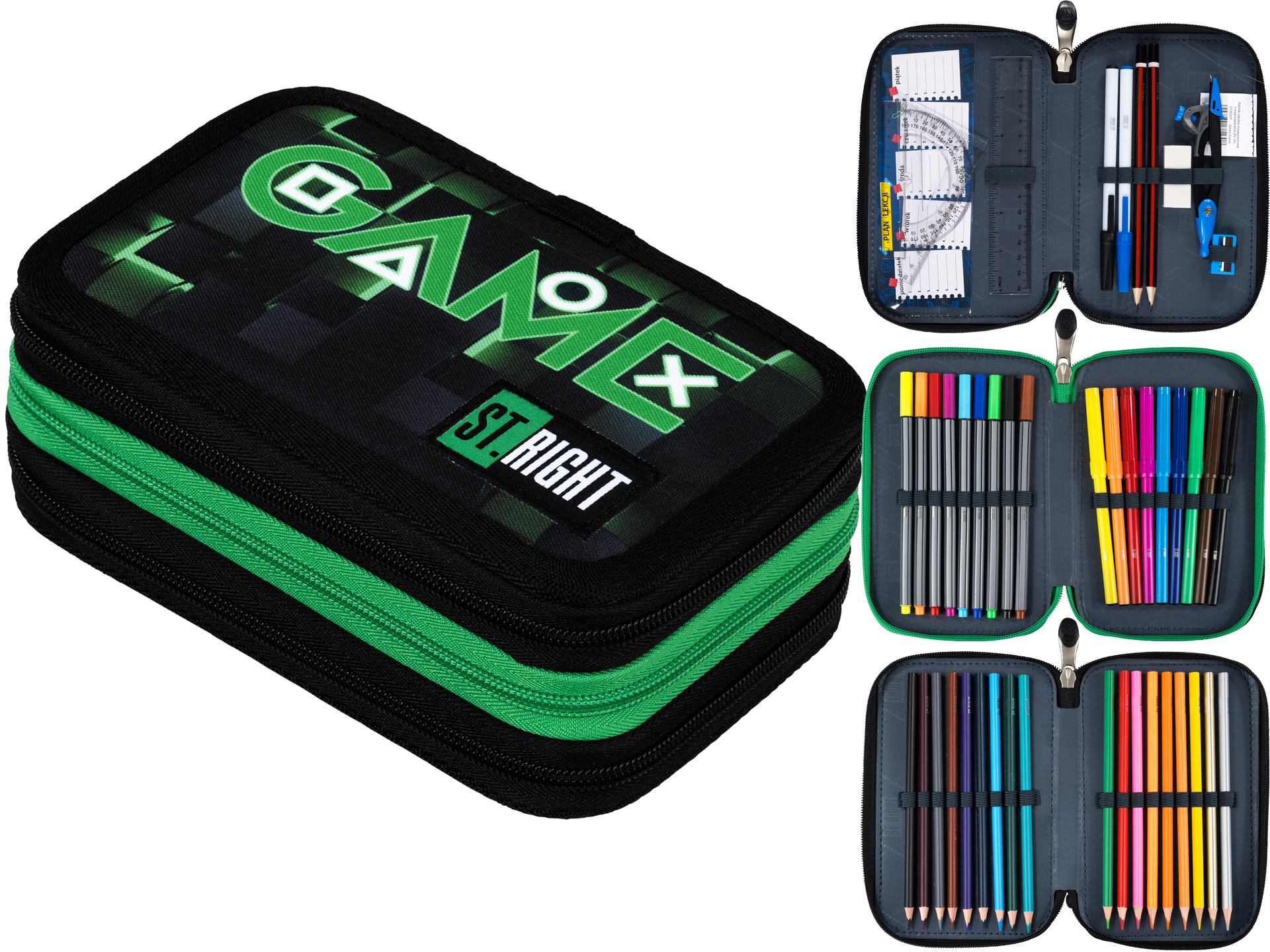 ST.RIGHT Potrójny PIÓRNIK Szkolny Trzykomorowy z WYPOSAŻENIEM Green Game