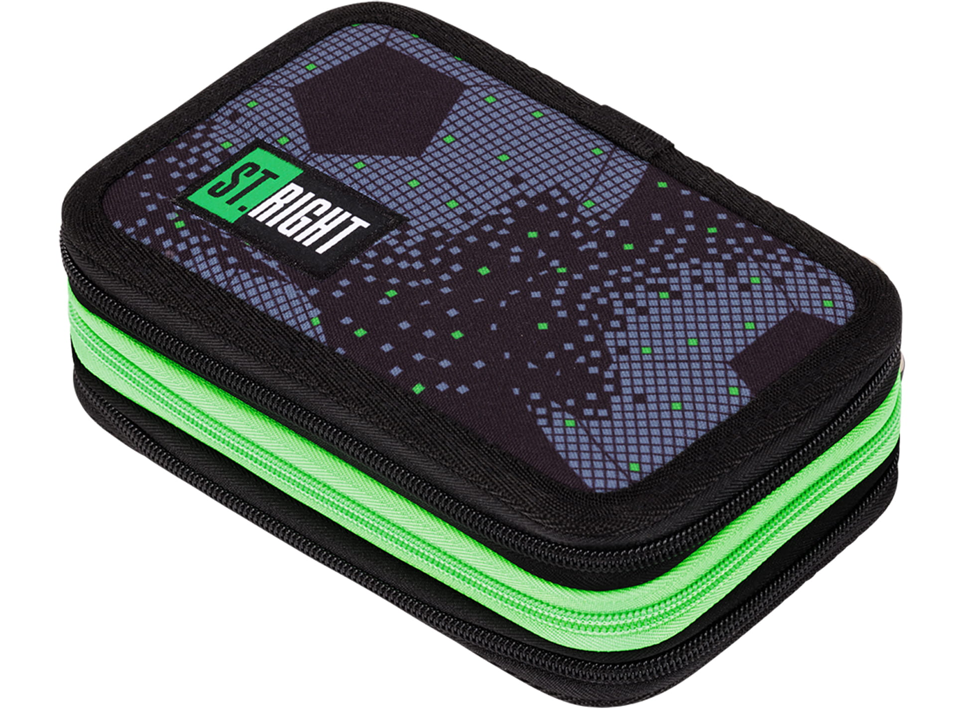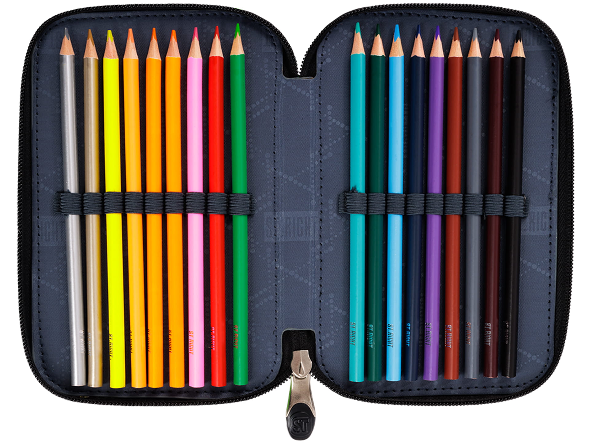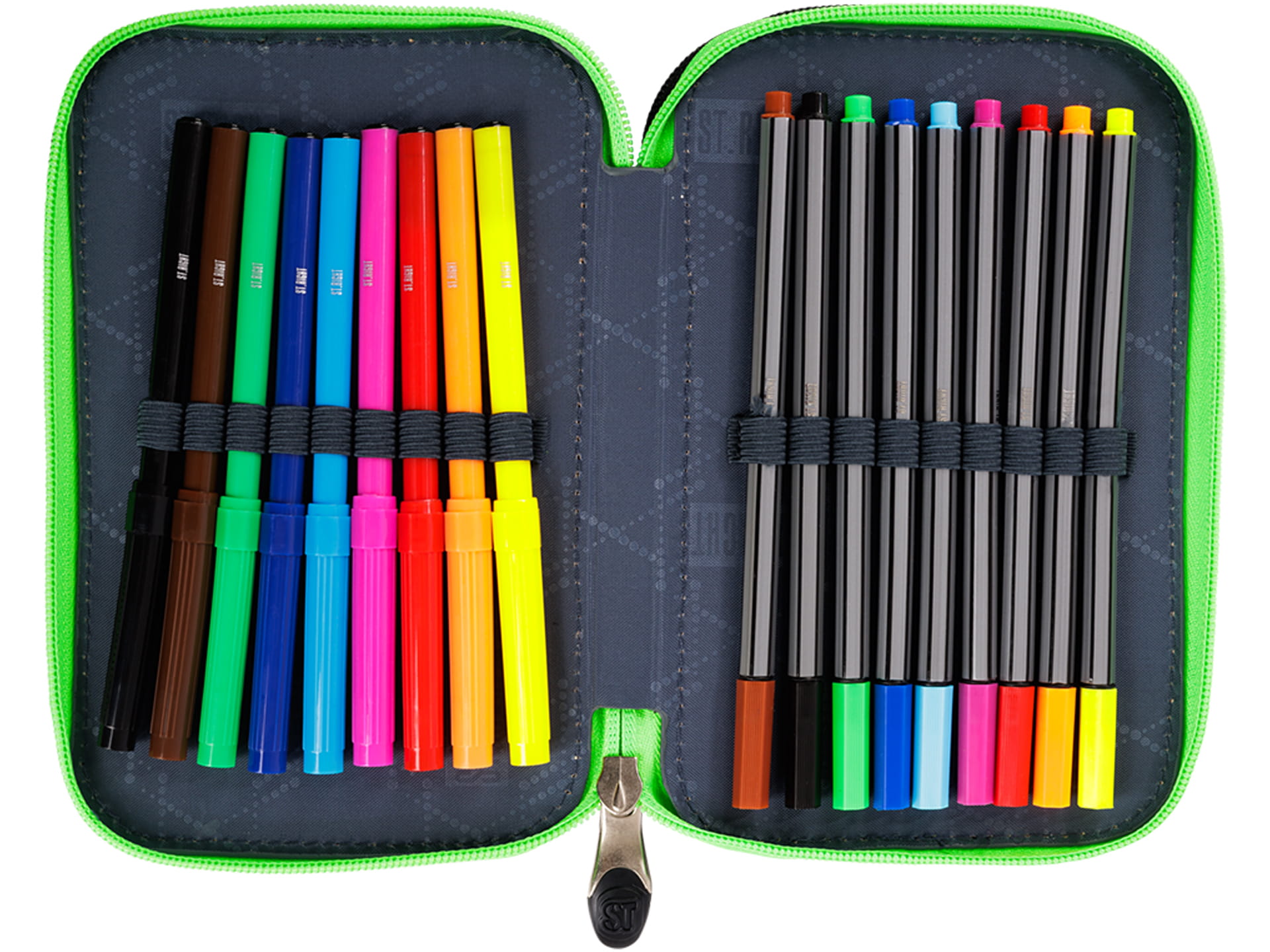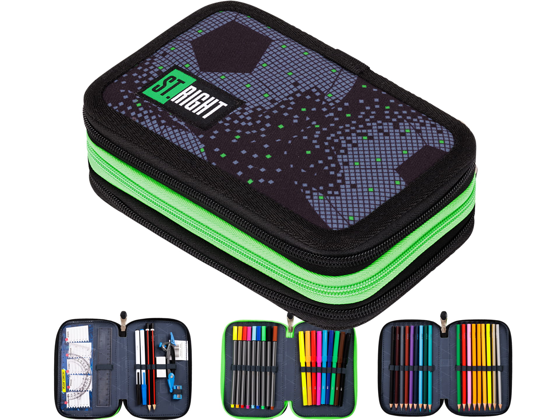 Potrójny piórnik z wyposażeniem wykonany jest