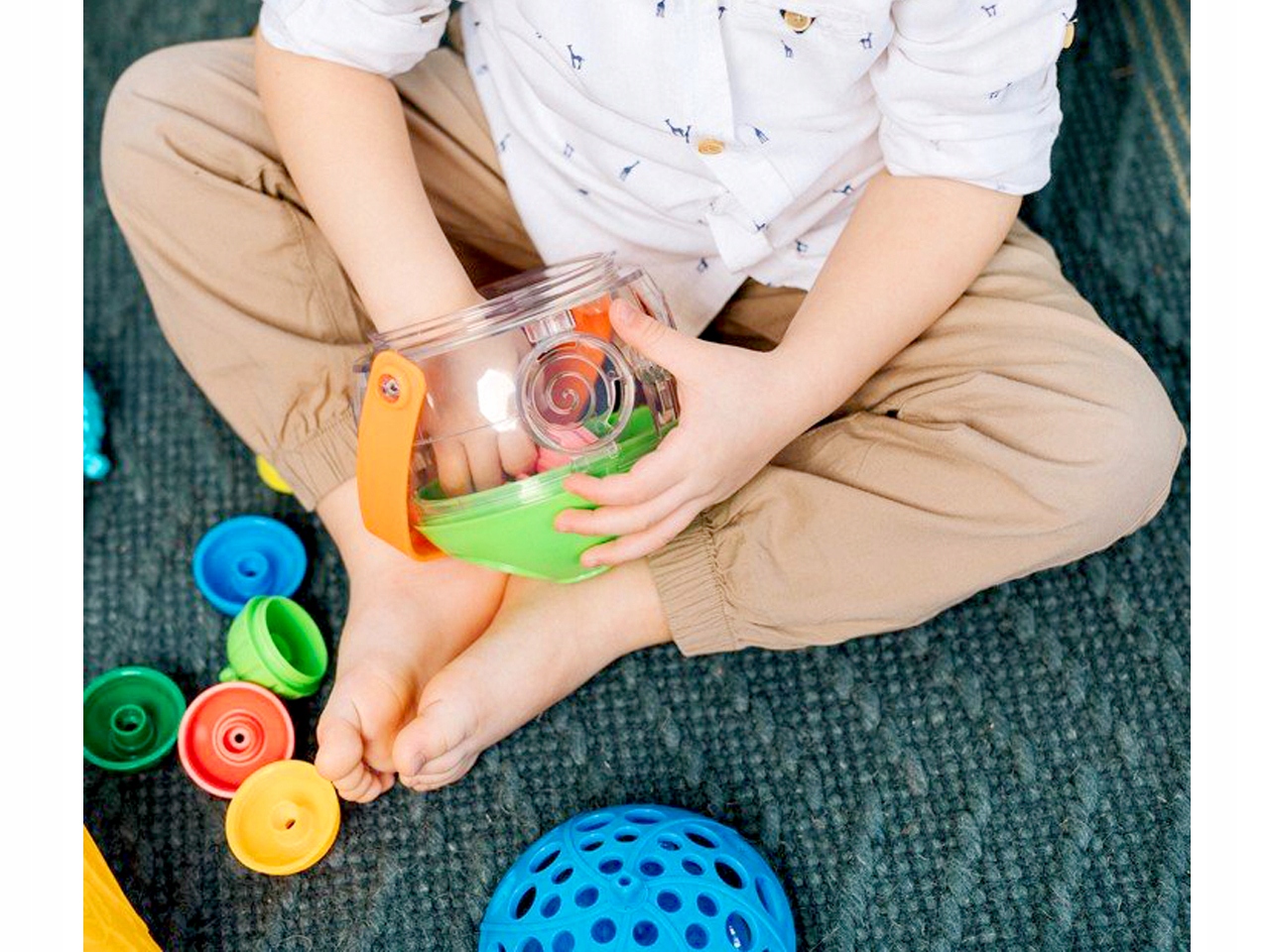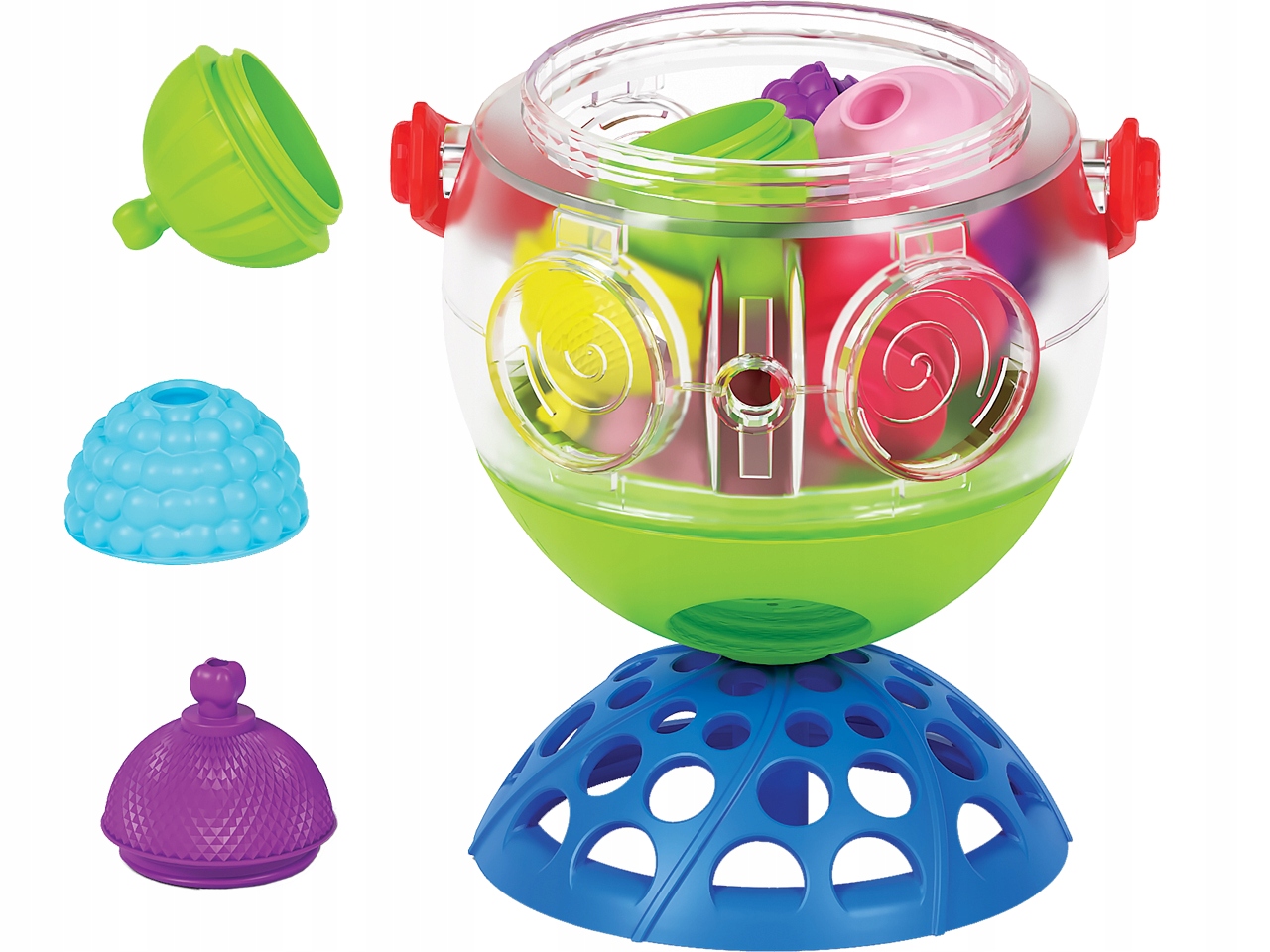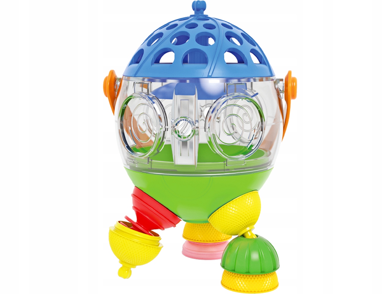 Wygodny uchwyt pozwala dziecku na swobodne przemieszczanie się z zabawką. Duży pojemnik pomieści wszystkie kulko-klocki dołączone do zestawu.