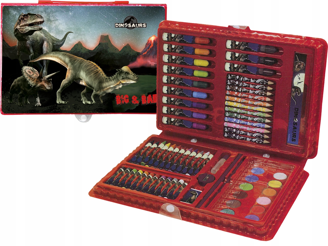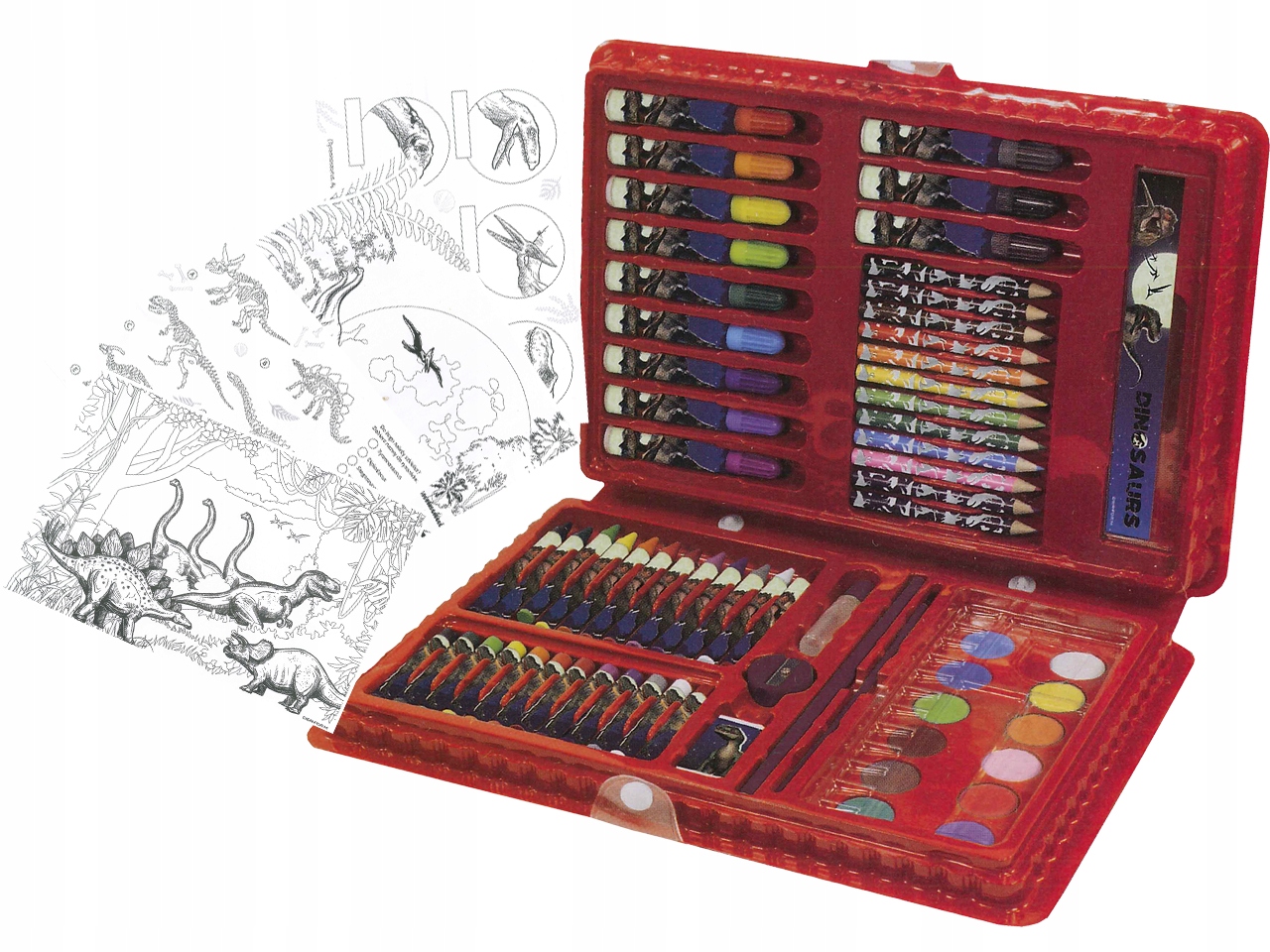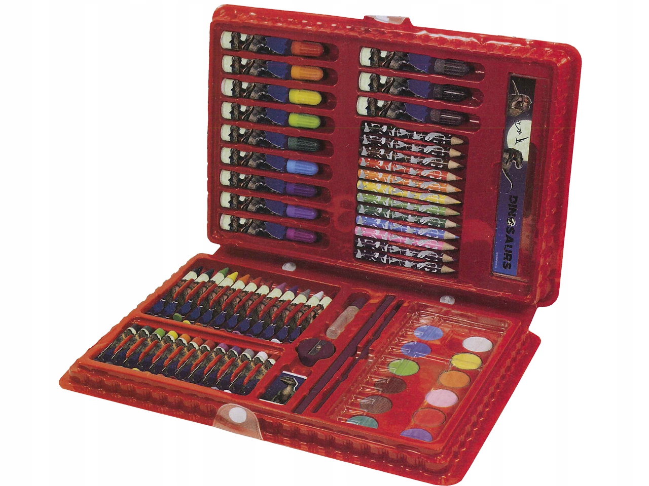 W zestawie znajdują się m.in.: kredki, flamastry, farby,